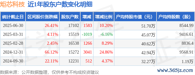 从股价来看,2025年3月31日至2025年6月30日,炬芯科技区间涨幅为26.41%,在此时间鼓励户数加多1583.0户,增幅为10.2%。
