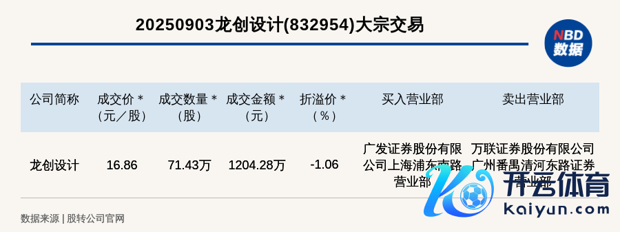 每经讯,2025年9月3日,新三板翻新层公司龙创操办(832954九游体育app娱乐,收盘价:17.04元)发生一笔巨额交游,成交价16.86元/股,成交数目71.43万股,成交金额1204.28万元,折价1.06%。买入交易部是广发证券股份有限公司上海浦东南路交易部,卖出交易部是万联证券股份有限公司广州番禺清河东路证券交易部。