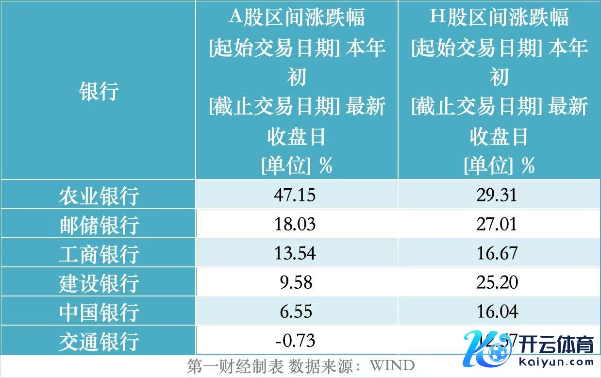 港股商场上,农业银行雷同涨幅最初。Wind数据败露,岁首于今,农业银行、邮储银行、确立银行H股股价差别飞腾29.31%、27.01%、25.20%;工商银行、中国银行、交通银行年内H股涨幅差别为16.67%、16.04%、12.57%。