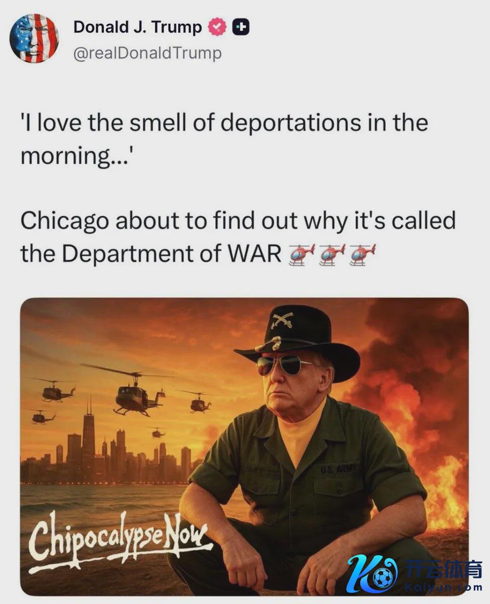 9月6日早些时候,特朗普在其“真确酬酢”平台上发布了一张疑似由东谈主工智能生成的图片,并配文说:“芝加哥将会知谈(国防部)为什么要被叫作战斗部。”