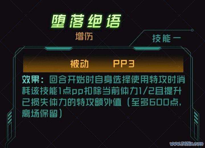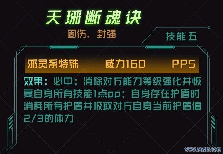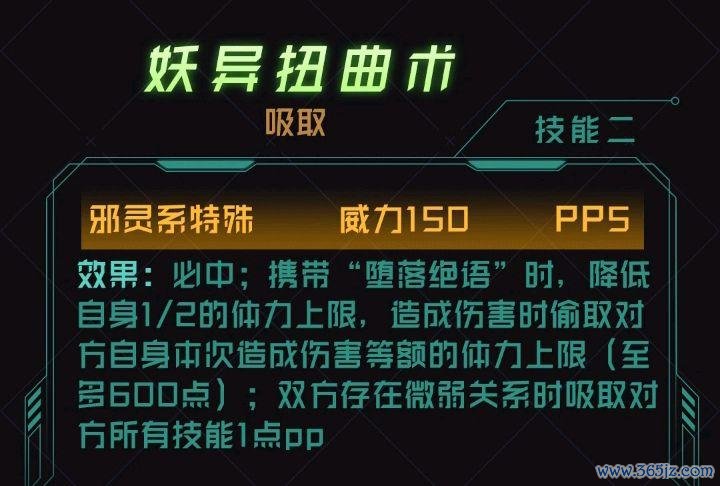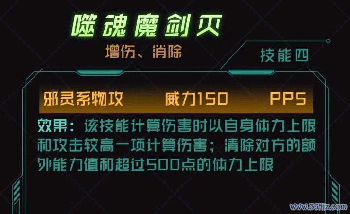 针对“高膂力”敌手。必中,带“退步绝语”时扣我方膂力上限,但能偷对方膂力上限(最多600);打轻浅敌手还能吸PP。打BOSS相通用,偷完膂力上限后,敌手续航材干大减,摩哥斯我方也变相变肉了。